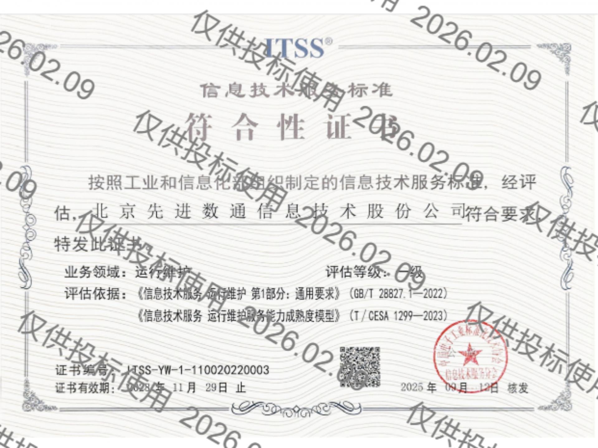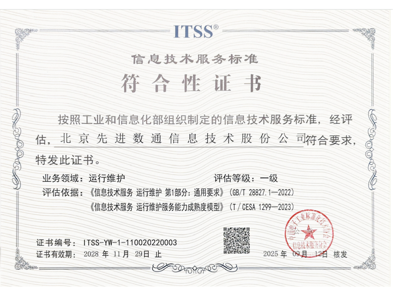 MG冰球突破官网先后取得CMMIL5、软件能力成熟度五级(SPCA 5)、信息系统建设和服务能力评估体系(CS)5级、ITSS成熟度一级、信息系统安全集成服务资质二级、信息系统安全运维服务资质二级、国产化信息系统集成和服务能力评估四级(LS4)、北京市企业技术中心等资质认证,并取得ISO9001、ISO20000、ISO27001、ISO14001、ISO45001、ISO22301、ISO37001、ISO28001、GBT29490等标准体系认证,具备行业领先的技术开发、工程实施及服务保障能力。
